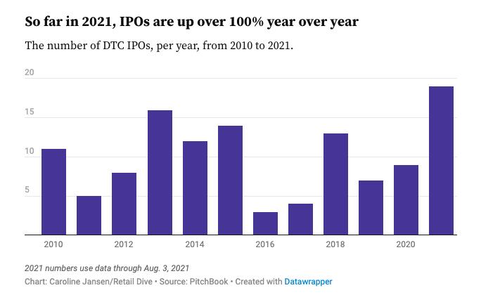 Casper的上市之路惨淡收场,但也难掩海外DTC品牌的上市热潮。截至目前,2021年,海外DTC品牌上市的数量已达到19家,创下数十年的记录。