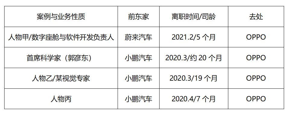比如OPPO,去年3、4月连续从小鹏汽车挖掘了首席科学家郭彦东,以及视觉专家陶训强、冯天鹏。在今年5月,蔚来一位数字座舱与软件开发人员也投入OPPO帐下。