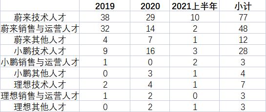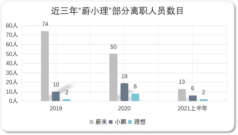 根据我们统计的样本,蔚小理在2019年流失87人,2020年流失77人,2021上半年流失仅为21人,数据基本上与行业发展脉络吻合。2019年,三家九死一生,人才流失最为严重。一年后,因为互联网巨头入局挖角与旧势力反戈,人才市场热闹非凡。到了今年,三家基本盘稳固,头部格局初现,流动才变得不那么剧烈。