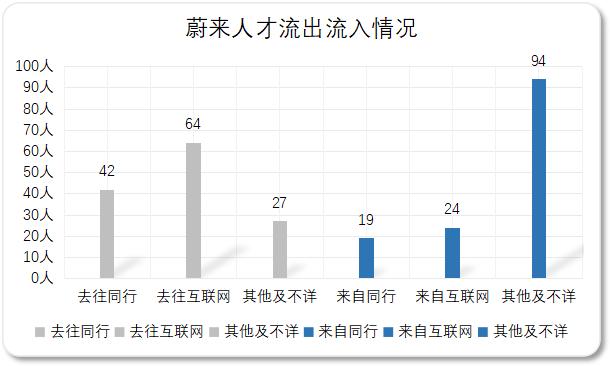 以蔚来为例,在总计137个样本中,离开蔚来的去处较为清晰,去往互联网行业者虽然较多,不过大多属于运维与市场销售人员。那些技术、软件人才主要还是流向同行。