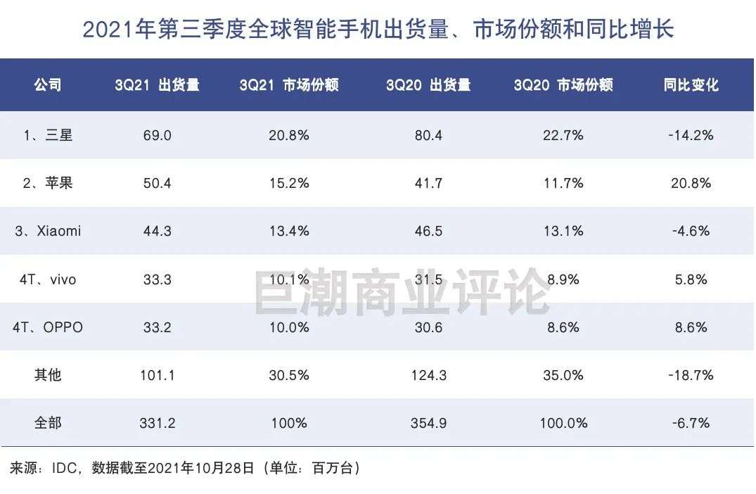 从市场调研机构IDC公布的数据来看,小米手机第三季度的全球出货量表现并不是那么糟糕,下滑4.6%的成绩明显强于老大三星,也强于行业整体的增速。