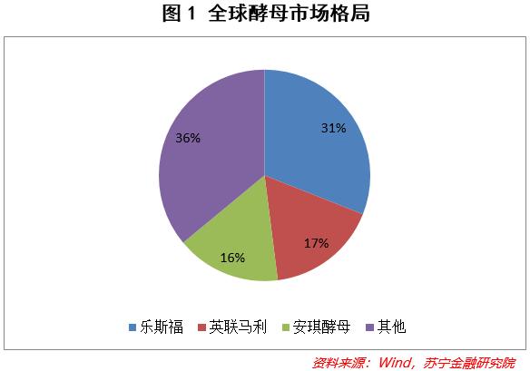 酵母是一种植物单细胞真菌,主要包括面包酵母、酿酒酵母、YE、生物饲料添加等。全球酵母行业发展较为成熟,市场格局相对稳定,全球三大酵母公司分别是法国的乐斯福,英国的英联马利和中国的安琪(见图1)。