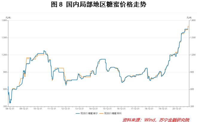 2021 年以来(见图8),糖蜜市场价格由约1200元/吨上行至目前约1650元/吨,三季度的价格同比上升了36%。