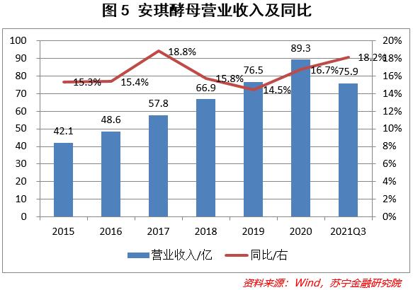 近年来,安琪酵母营业收入稳步增长(见图5),由2015年的42.1亿上升至2020年的89.3亿,年复合增速为16.2%,2021年前三季度同比增长18.2%。与此同时,酵母业务维持较为稳定的盈利能力,近四年来毛利率稳定在40%左右。随着业务多元化的发展,公司酵母业务的占比逐步下降,由2012年的88%下降至2020年的77.7%。酵母的营收增长来源于量和价的双驱动,其中主要以量增为主,近七年,酵母业务的增速为15%,而同期销量增速为12%。