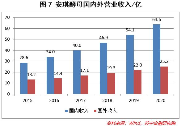 安琪酵母的发展实行国内、国外两条腿走路。2015年至2020年(见图7),国内业务复合增长率为17.3%,国外业务增长率为13.7%;2020年海外业务收入占比接近三成。