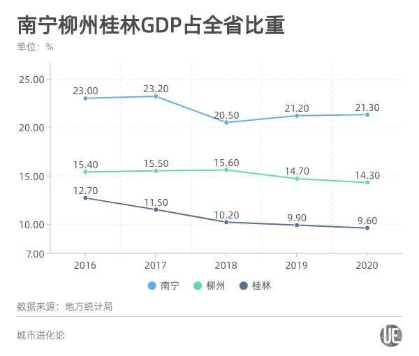 不过,尽管2020年南宁GDP总量占比较上一年度提高了0.1个百分点,拉长时间来看,2016年的占比达到23%——五年过去,南宁的经济首位度反倒下降了1.7个百分点。