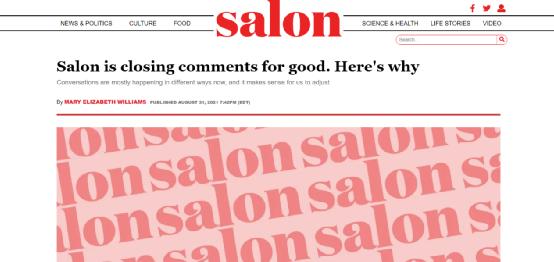 2021年9月30号,美国新闻与评论网站Salon正式关闭其评论区,其负责人表示,“当前受众与媒体的互动方式发生了很大程度的改变,我们也将因时而变进行调整。”