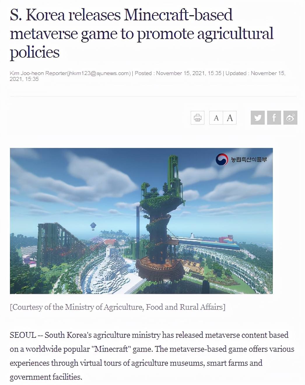 值得关注的是,这个游戏正是基于Minecraft进行的二次开发,而韩国农业部发言人Kim Ki-hoon表示: “我们将加快利用元宇宙平台,向千禧世代和 z 世代宣传农业价值”,也会支持用户在虚拟世界中创建自己的农业空间。