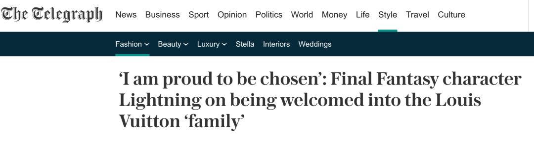 这是当时刊登在媒体上的标题:《“我很自豪被选中”:最终幻想角色闪电被欢迎加入路易威登“大家庭”》。显然这是第一人称视角的表态。