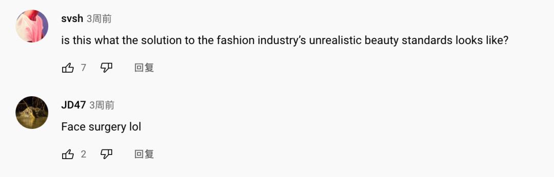当然也要提醒品牌,如果真的要做这样的探索,就要充分考虑到拟人化后也存在“坑”。比如Prada推出Candy广告后,社交平台就出现了负面的声音:“整形脸”、“这就是时尚产业的审美标准?”