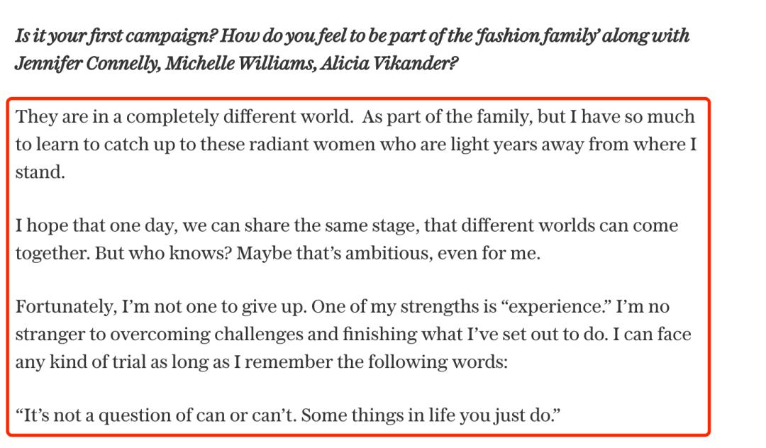 “时尚不是那种你可以教授和给予的东西,它是从每个人自己不同的品味和选择中诞生的。通过它,你向你身边周围的人展现出自己的本质。”她解释说:“我之经历过不少危险的事件,但这次对我来说是一个激动不已,从未有过的体验。LV 是一场全新的冒险,一个新的幻想,我发自内心的享受这个过程。”