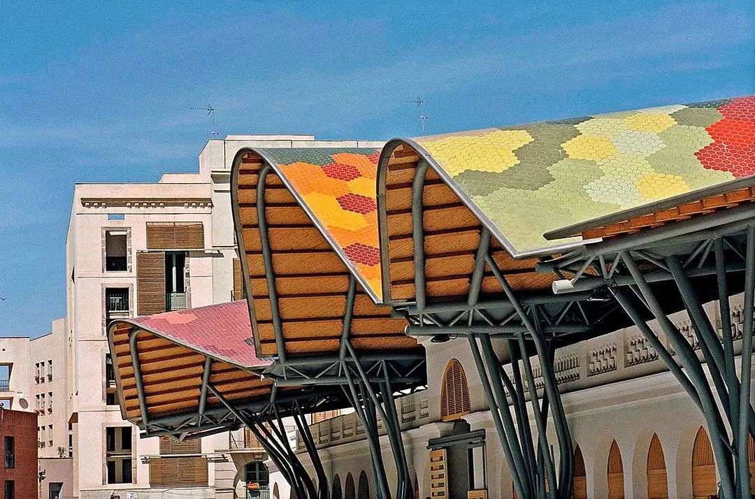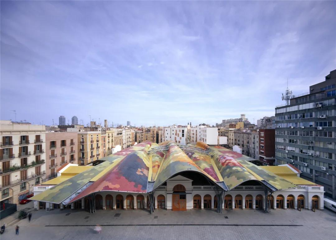 这个位于巴塞罗那市中心以东的菜市场,自1845年便开始使用,浓缩了整座城市19世纪哥特式建筑的灵魂,而在菜市场之下则埋藏着12世纪的建筑废墟和一座4世纪的墓地,堪称一个小型的建筑历史博物馆。所以在改造这个菜市场时,建筑团队希望尽可能少地影响基地历史,凌空伸展出一个由钢、混凝土、木材和陶瓷制成的巨大彩色屋顶将旧市场重新覆盖。