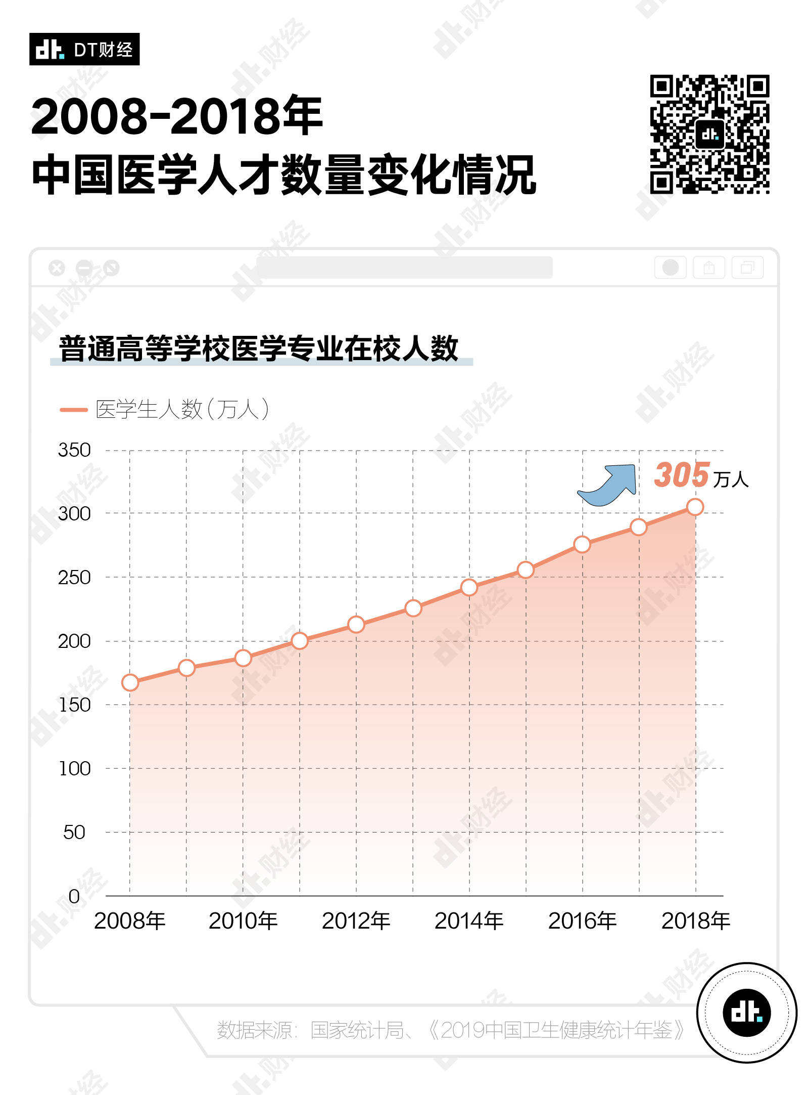 《2019中国卫生健康统计年鉴》显示,2018年中国普通高等学校医学专业在校人数,达到了305万人。这个数字,相较2008年上涨了82.3%,如今仍在快速增长。