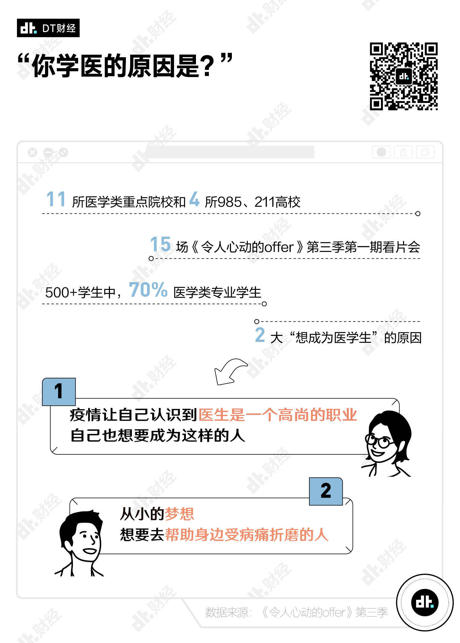 这也是许多医学生选择医学的初衷。11月中,《令人心动的offer》曾联合北京大学医学部、中国医科大学等 11 所医学类重点院校和暨南大学、东北大学等4所985、211院校组织了15场节目看片会,有超过500+名医学生参与,其中70%为医学类专业学生。