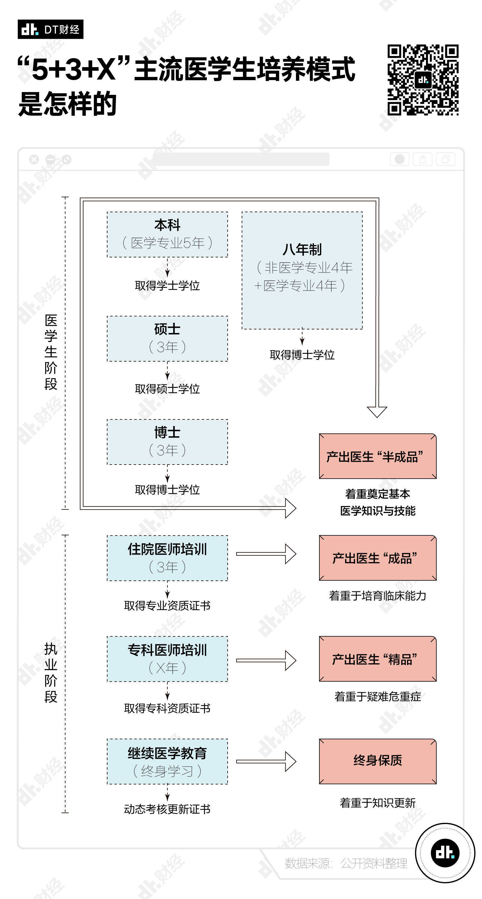 目前来说,中国医学生的主流培养过程是“5+3+3”。5年制本科,3年硕士,3年博士。要成为能独立行医的临床医师,必须经过“3+x”规范化培训,即3年住院医师规范化培训和2-4年专科医师规范化培训。道路千万条,成功的路只有一条,就是学中干,干中学。