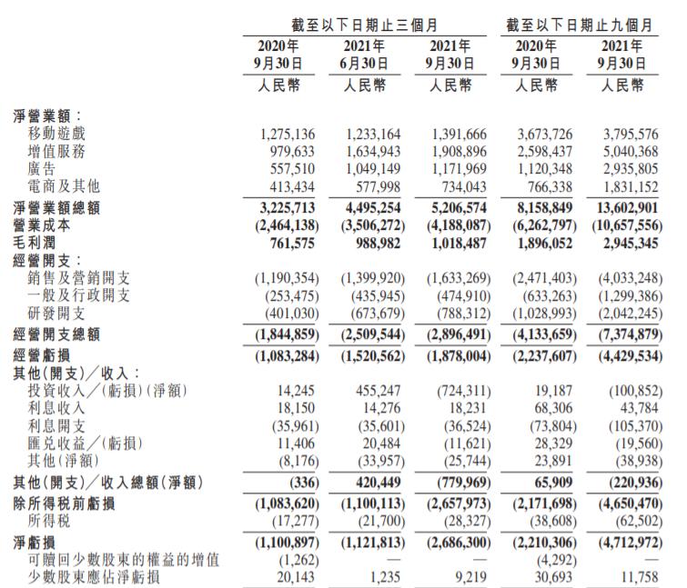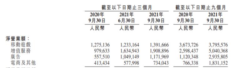 细分业务方面,哔哩哔哩第三季度移动游戏业务营收为13.917亿元(2.160亿美元),较2020年同期增加9%;增值服务营收为19.089亿元(2.963亿美元),较2020年同期增加95%。