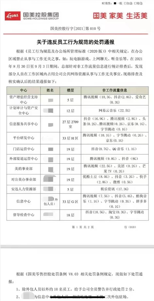 11月16日,一则由国美发布的《关于违反员工行为规范的处罚通报》在网上流传。文件显示,在8月30日-9月30日期间,国美发现部分员工在工作时间玩游戏、聊天、听歌等。根据公司规定,对这11位员工 (包括一名外包人员) 进行了通报和相应处罚。