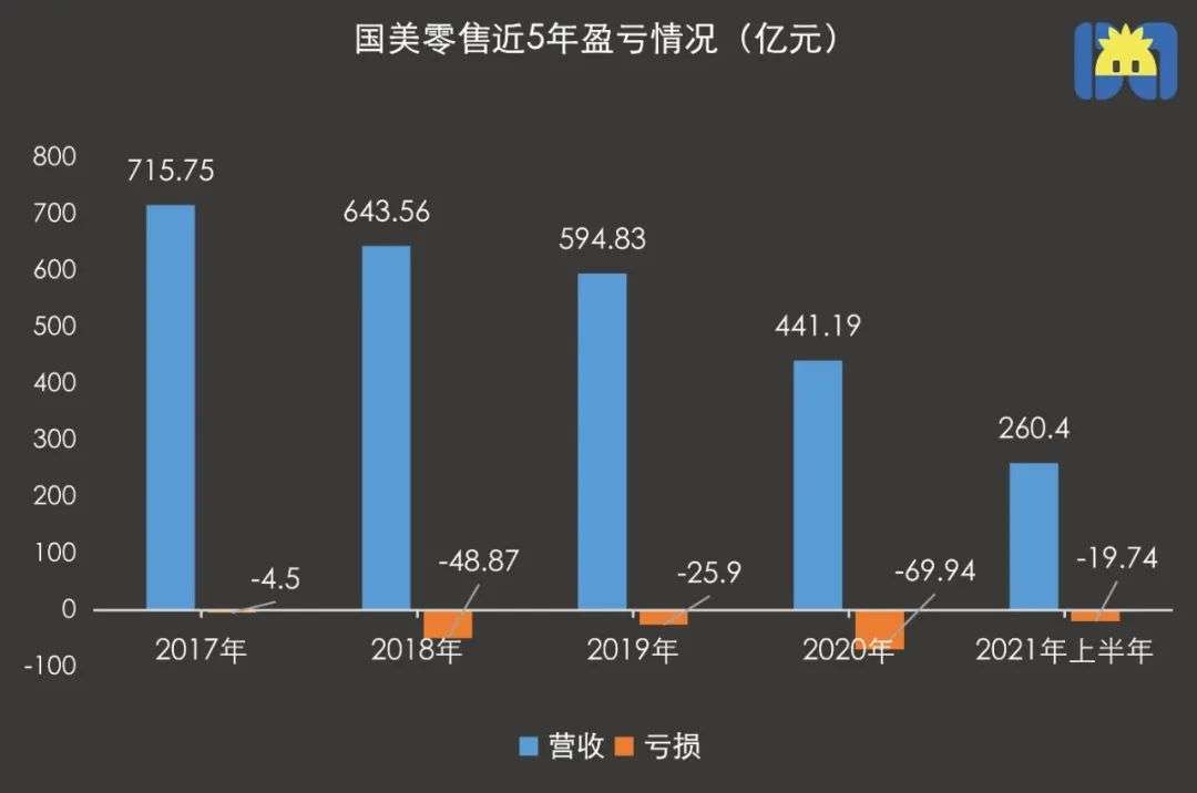 家电市场受到疫情的影响进一步收缩,直播电商的新业务发展迟缓,国美陷入持续亏损的窘境。财报显示,国美零售2021年上半年营收260.4亿元,同比增加36.5%,归属母公司净亏损达19.74亿元,同比缩窄24.7%。这是国美连续亏损的第5年,5年累计亏损额达168.95亿。