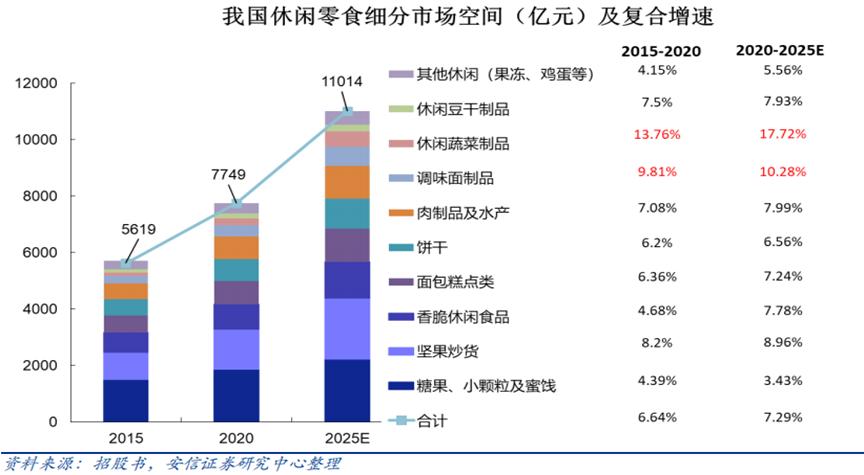 根据弗若斯特沙利文报告,2020年中国休闲食品行业市场规模7,749亿,2015年至2020年复合增长率仅6.6%,预计到2025年将达到1.1万亿,对应2020年至2025年年复合增长率为7.3%。