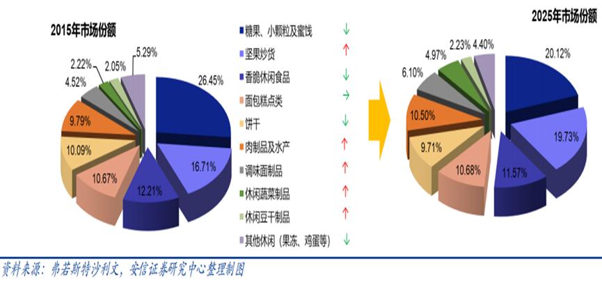 而反观糖果蜜饯、坚果炒货、香脆休闲食品这三个占比最高的品类,市场占比将由2015年的26.45%、16.71%、12.21%,变化至2025年的20.12%、19.73%、11.57%。