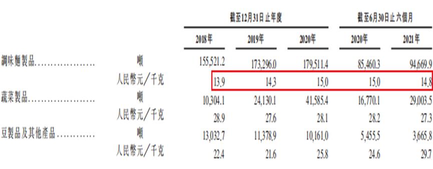 从2018年到2021年上半年,卫龙辣条平均售价从13.9元/kg上涨至14.8元/kg,两年时间价格上涨了6.5%。蔬菜制品单价稳定在28元/kg左右,相当于辣条的一倍。