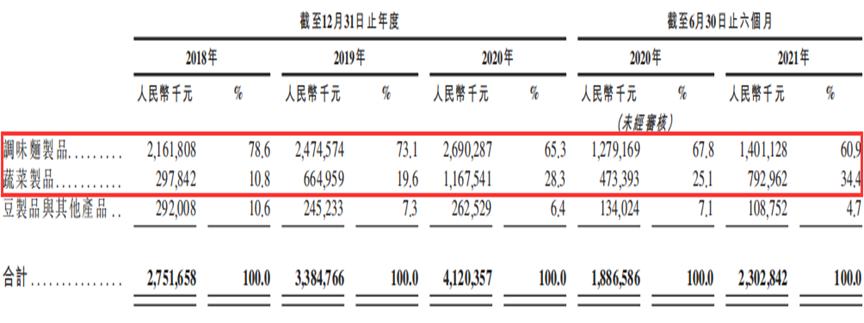从2018年到2020年蔬菜制品业务从2.78亿增长到11.68亿,增速分别为123%、75.64%,营收占比也从10.8%提升到28.3%,而2021年上半年这一数字已上涨到34.4%。