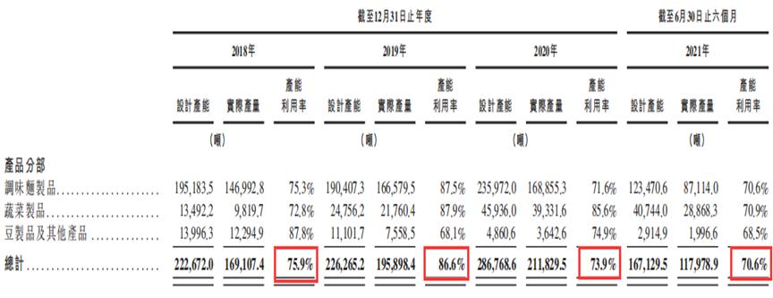 2020年底卫龙设计产能28.68万吨,实际产量为21.18万吨,产能利用率为73.9%。而截至2021年6月底,卫龙产能利用率已降至70.6%。