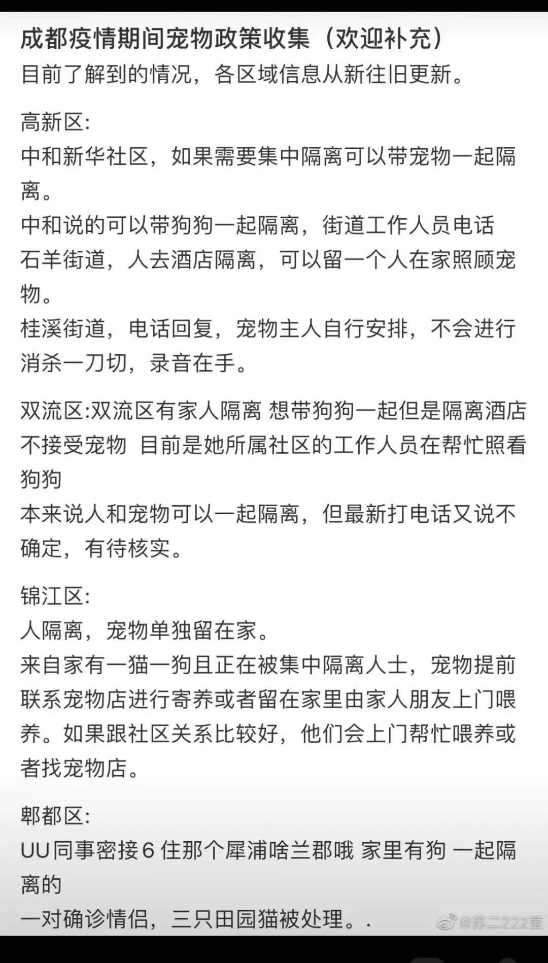 几天下来,群友中有人明确收到过双流区允许携宠隔离的答复,还有网友得到成华区回复称“若人被隔离,宠物可以寄养或给其他人帮忙养”,甚至有人咨询后被告知“市里在紧急开会研究政策”。李晓把这些截图发在微博上,并逐条整理成长图,然后继续号召大家,“不要停止发声,继续呼吁!为了我们的毛孩子。”
