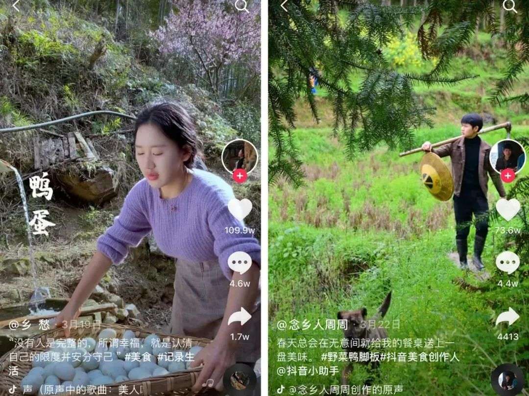 早几年,从乡村、小镇走红的草根网红数量也不少,但是不时会被贴上恶俗的标签。这两年,展现农村面貌的视频,越来越偏向于展现传统的农耕文明及小作坊式的家庭生产过程,如春种秋收、设酒杀鸡、建房造物......