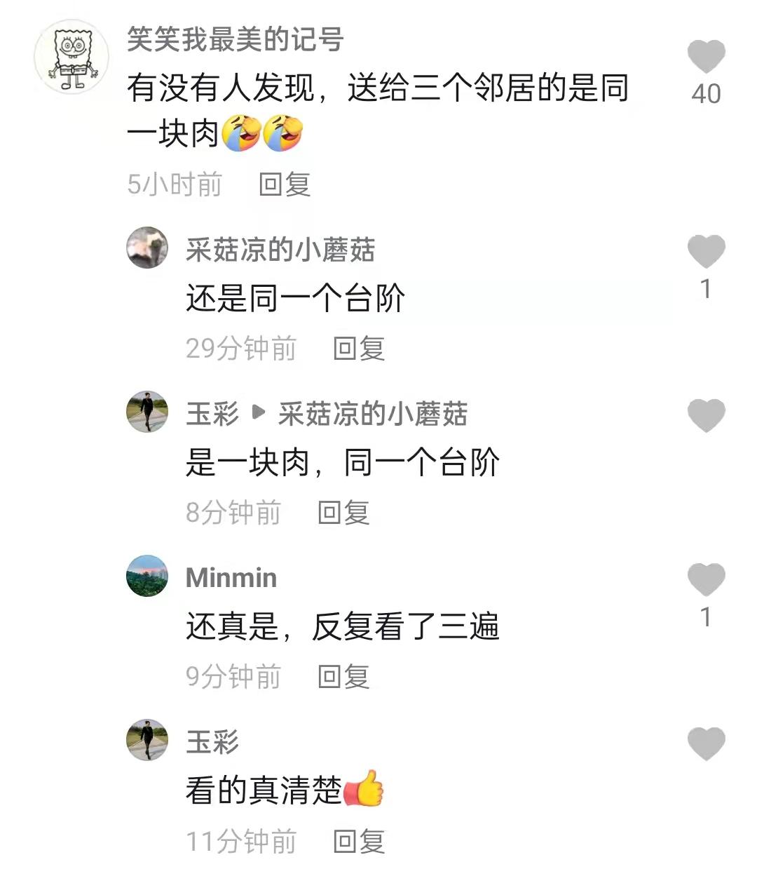 表演痕迹是无法完全隐藏的。比如在乡村美食达人“潘姥姥”的评论区就有“列文·虎克”发现,其视频中送给三个邻居的肉是同一块,邻居家门前的阶梯也是一模一样。