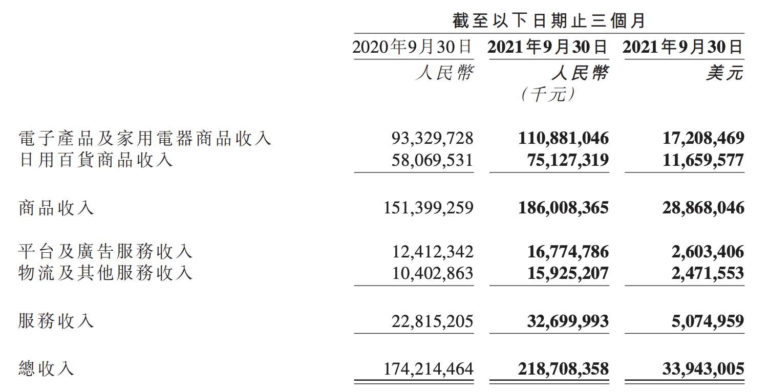 三季度,京东零售实现收入1980.8亿,同比增长22.9%。拆开来看,电子产品及家电收入为1108.8亿,同比增长18.8%,此前市场普遍担忧房地产市场“凉凉”以及限电限产会对家电品类销售带来强压制,但从实际效果来看,家电表现还算不错;此外,日用百货收入751.3亿,同比增长29.4%;平台及广告服务收入167.74亿,同比增长35.2%,两项数据(商品和服务收入)都远超阿里巴巴,且跑出了全社会线上零售两倍的增速。