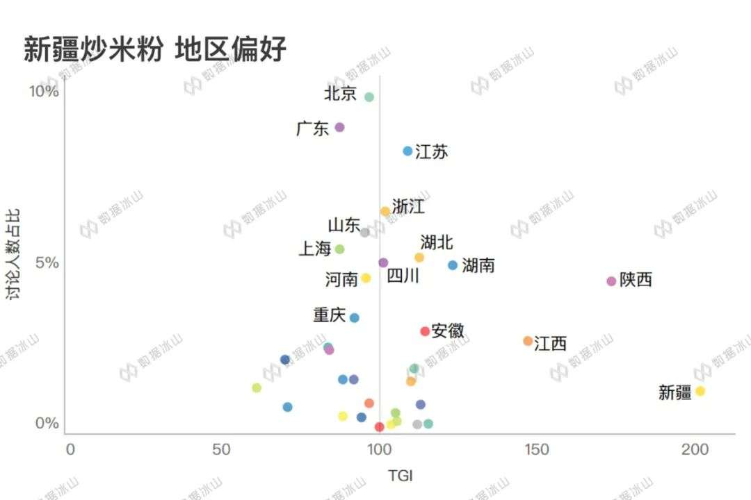 具体来看新疆炒米粉的情况,可以发现,虽然新疆的TGI超过了200,占据了绝对主导位置,但其他地区的接受程度也不低。