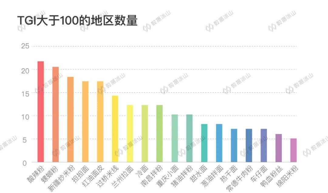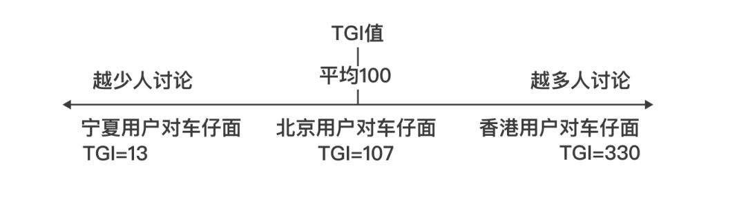 因此,以100作为TGI的平均值,TGI越大,这个地区就有越多朋友讨论这个粉面,接受程度越高,反之。这个指标的好处在于,能发现网民不多的地区,他们的接受程度如何,比如香港用户对车仔面接受得非常广,而宁夏用户则闻所未闻。
