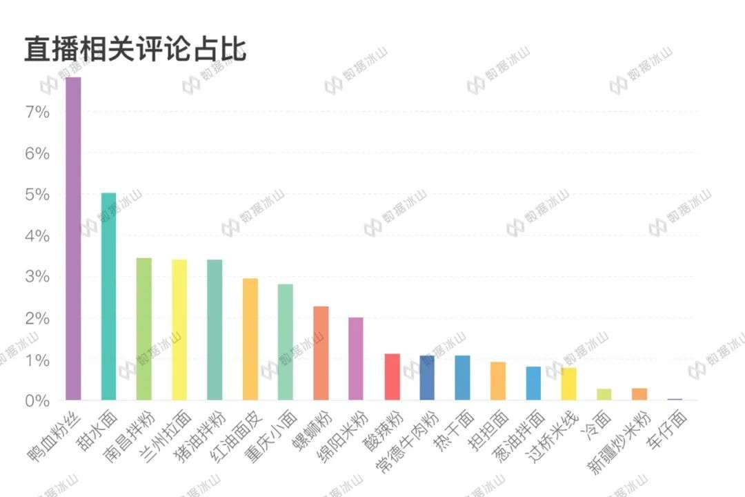 而鸭血粉丝的情况和猪油拌粉类似,消费者对内脏和鸭血的口感不习惯,对产品本身接受度不高。此外,从评论中也可以看到直播的提及率较高。