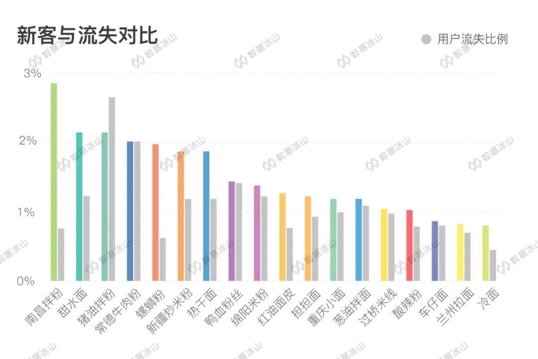 新的消费者来了,那品牌能留住老客吗?我们对比了新用户占比和用户流失占比,赫然发现有几个粉面处于危机当中。