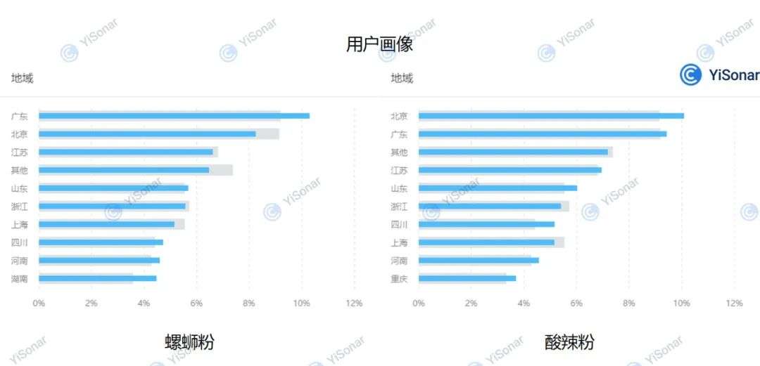 我们不妨来看看用户画像,都是哪些地方的人在讨论这些粉面。