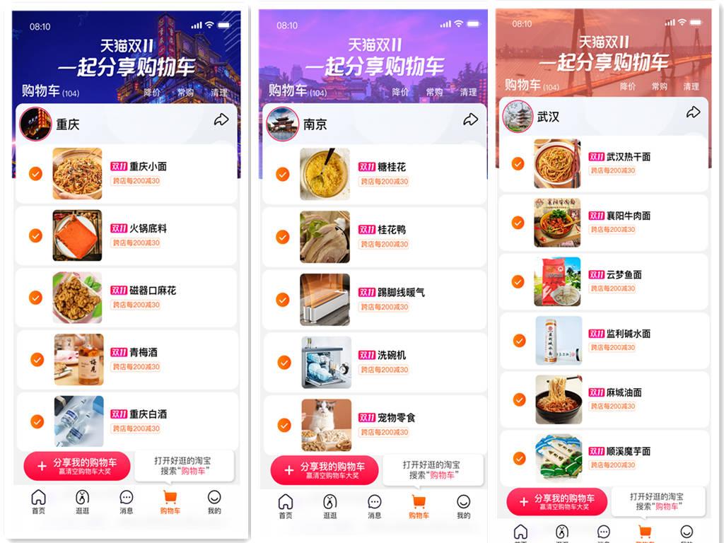 而在刚刚过去的双十一,天猫上线了一键分享购物车的功能。大家的购物车中,也不乏各地特色美食,尤其是各类速食粉面。