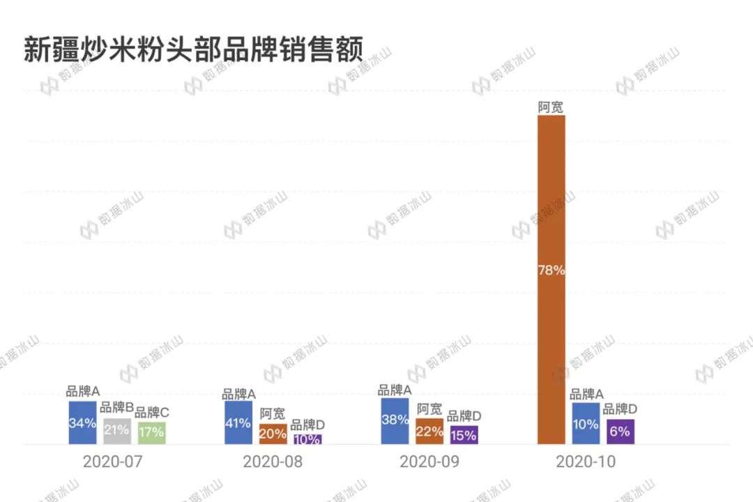 等到10月,阿宽利用自己地域美食家的身份,成功将新疆炒米粉带到大众的视野中。可以看到,其他头部品牌的销售额与之前基本持平,阿宽并没有抢走别的品牌的市场份额,而是生生创造出了一片属于阿宽自己的天地。