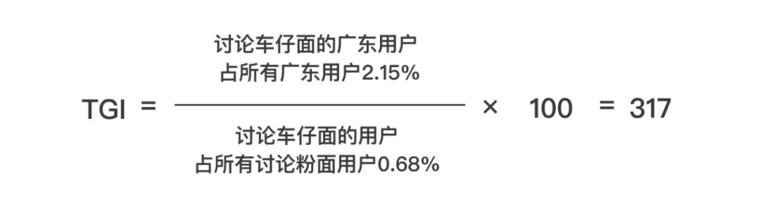 以广东的车仔面为例,社交平台上讨论车仔面的用户占所有用户0.68%,而讨论车仔面的广东用户占所有广东用户2.15%,广东用户对车仔面的偏好,远高于全国平均值。此时的TGI,则为317。