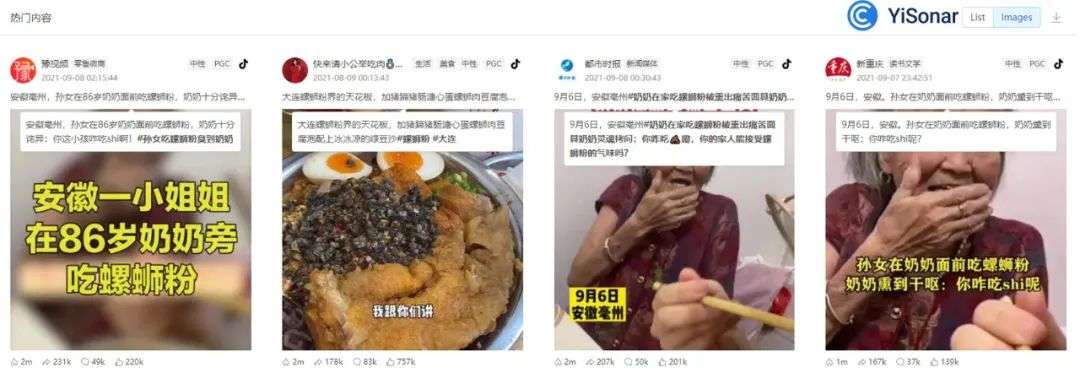 在热度最高的的抖音平台上,与螺蛳粉相关的热门内容,多是一则猎奇新闻,也恰好是21年9月发布的。