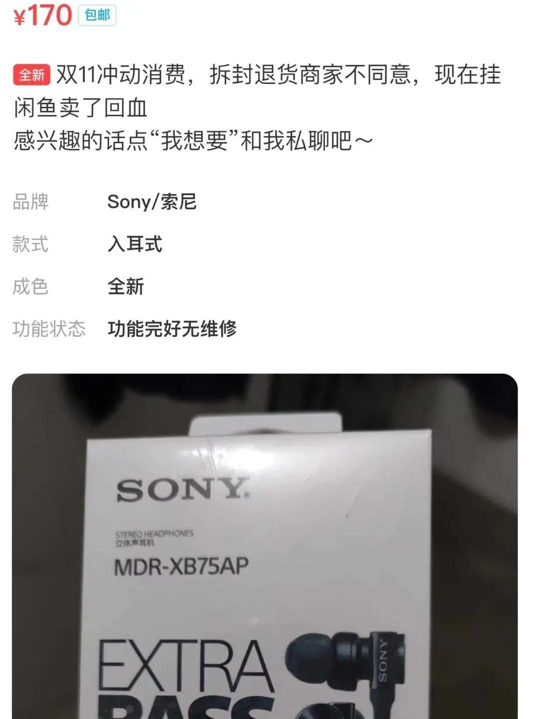 还有一类卖家,卖双11购买的物品是因为物品已经拆封,不符合商家的退货要求,只能转卖闲鱼。比如,下图中某用户挂出的耳机,就自称是因为冲动消费,拆封后商家不同意退货而在闲鱼上出售。