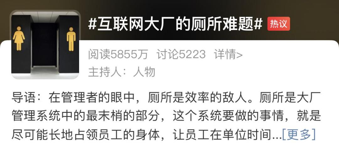如今,但凡是个能称得上“厂”的公司,在高峰期(此处代指8小时里的每一分钟)的厕所排队等位,简直都是家常便饭,上不了公司里的厕所,徒步去隔壁楼蹭厕所也成了不少人的新选择。