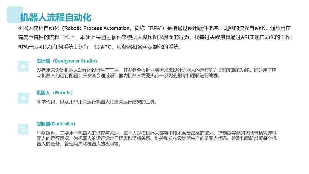 但目前国内企业的信息化建设尚在初期,大量数据存在结构化程度低的问题,RPA需要通过AI技术对非结构化的数据进行理解;AI组件输出的准确度越高,RPA可以渗透的场景就越多——可以说,AI能力在中国RPA软件的发展中起到了决定性的作用。