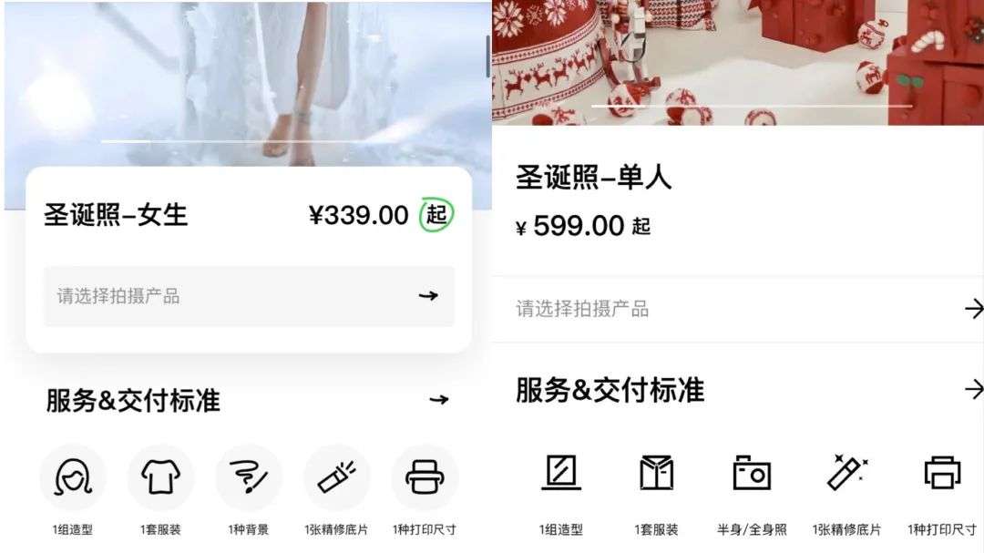 在海马体大师店,价格更贵。或许是“大师”光环加持,一张证件照收费259元;圣诞照系列则要699、799元。