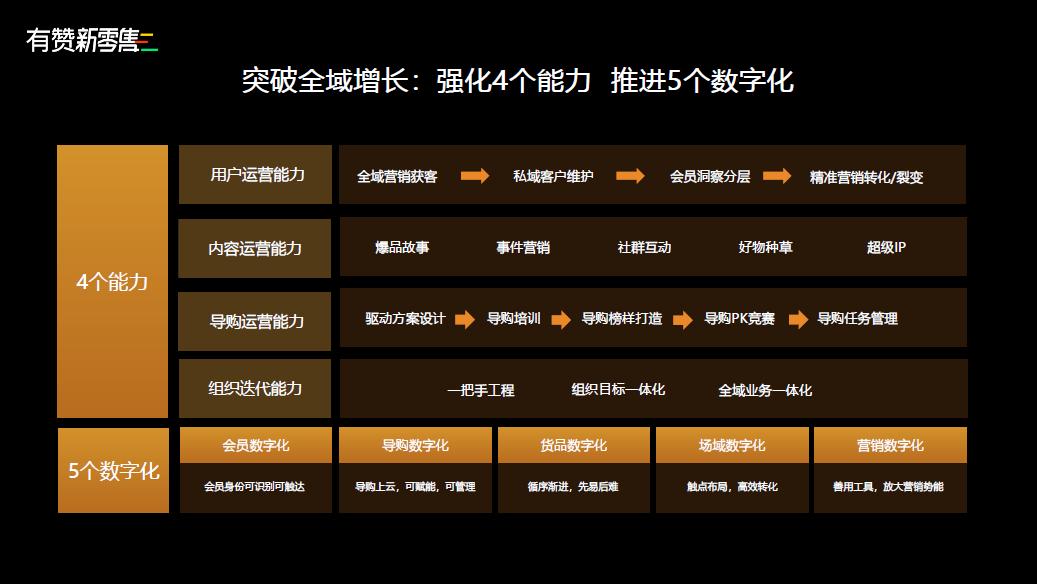 针对百购行业的现状,有赞提出了“强化4个能力、推进5个数字化的解决方案”。“四个能力包括用户运营能力、内容运营能力、导购运营能力和组织迭代能力四个方面;5个数字化则是指会员、导购、货品、场域及营销的数字化建设”。