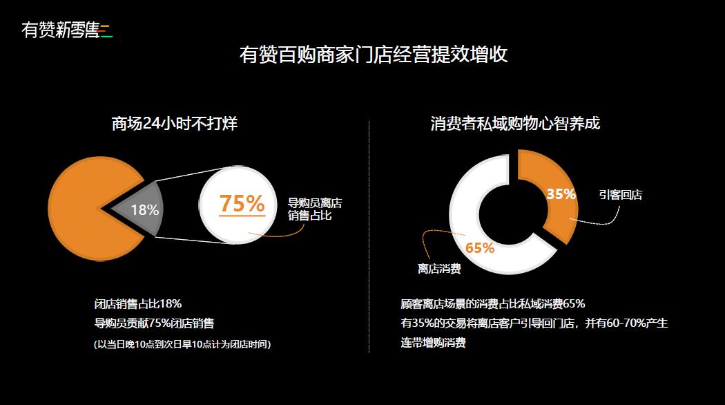“过去五年间,百购商家私域交易规模年复合增长率超过106%;其中会员用户(含商家会员、私域粉丝和企业微信好友)贡献的销售额占整体销售的比例超过了63%,会员用户平均每月的复购次数超过了3次;在商场闭店期间,带来了18%的销量,其中75%是由导购员下班后(当日晚22:00至次日早10:00)完成......”