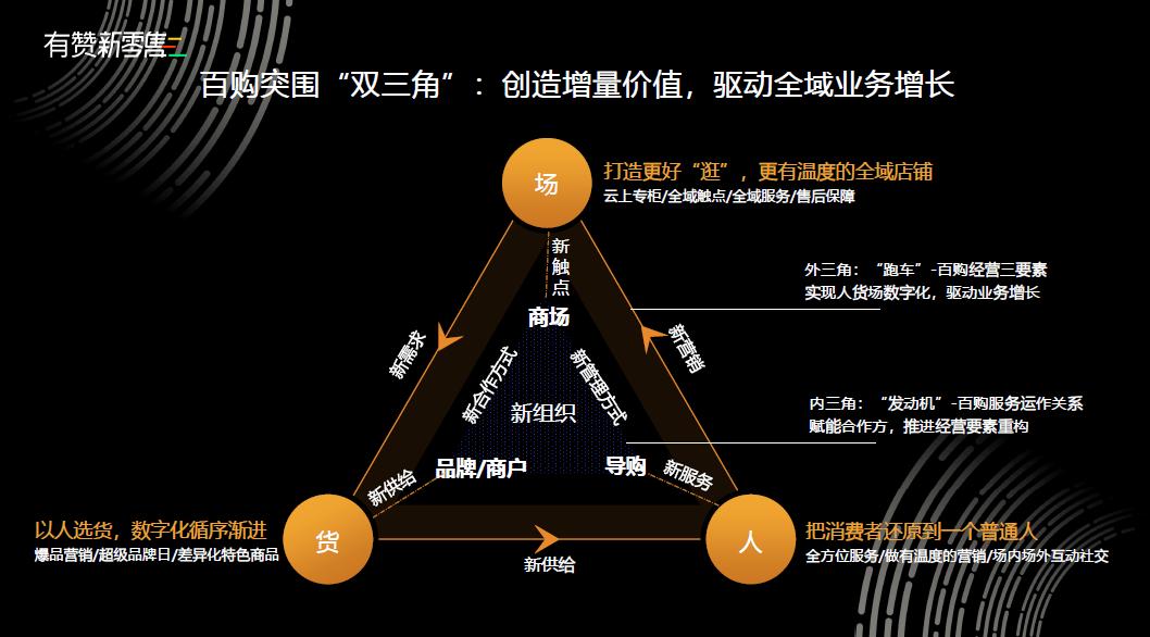 对于百购企业来说,在进行数字化升级和新零售转型的路上,仅仅盯着“人、货、场”的外功还不够,关予认为,百货商场和购物中心等传统零售渠道更应该关注企业的“内三角”,即“商场本身、品牌/商户、导购”这三大关键角色的提效与赋能。