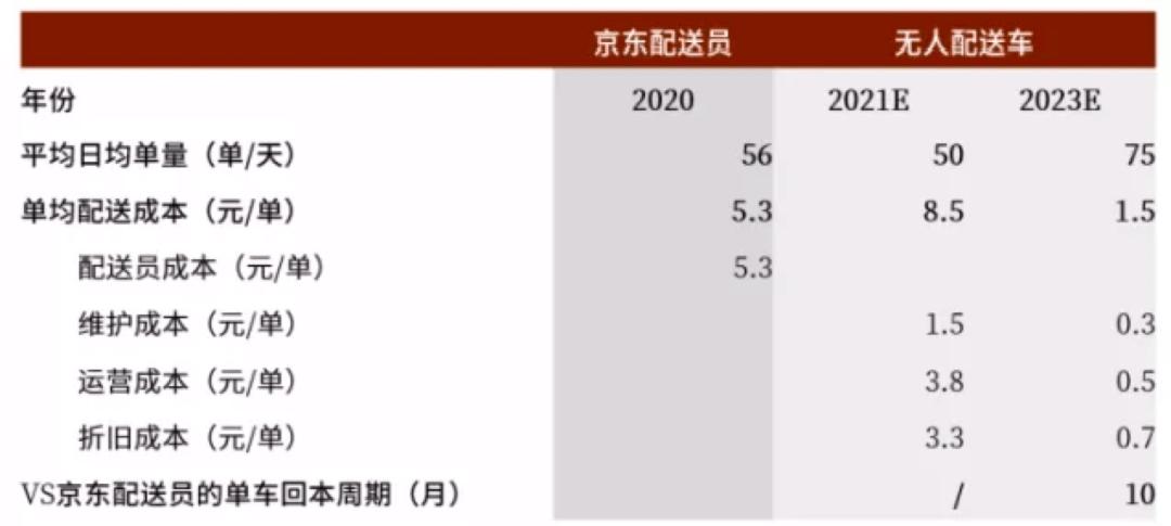 此前,中金在报告《无人配送,未来已来》中曾进行分析。2020年京东物流每单快递配送人力成本为5.3元,随着快递数量增加,这一成本很难再下降。虽然当前无人配送成本相对人力更高,但其边际成本会随着配送规模增长而下降,中金预计当2023年随着单车成本下降至10万元,以及单车日均配送单量提升和运营效率提升后,无人配送每单成本将降到1.5元上下,使用无人车超过10个月即比招聘一个快递配送员划算。