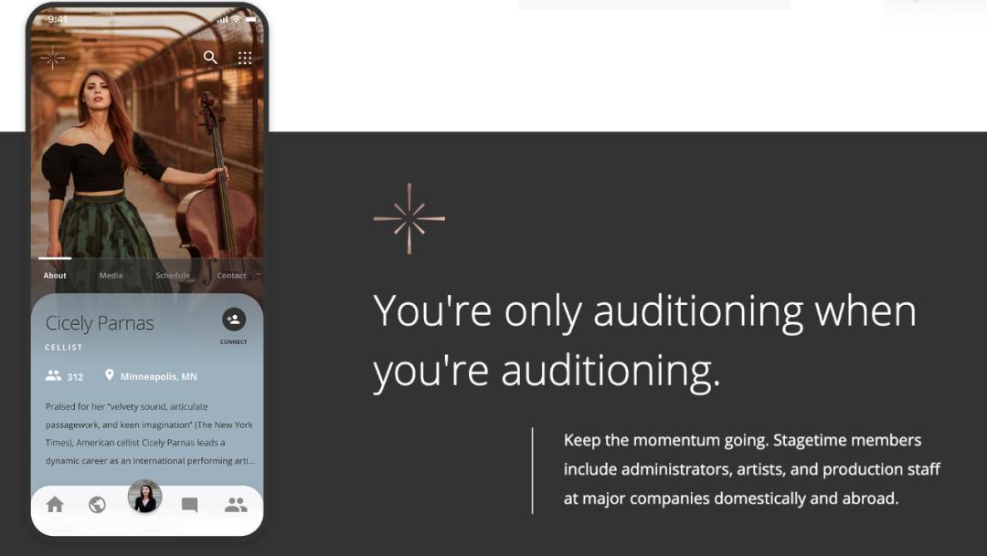 对于没有网页设计背景的普通行业人士来说,维护个人网站的成本高昂且耗费许多时间。但Stagetime的综合功能可以使艺术家不再需要将精力用于设计和维护个人网站,也不必再依赖个人社交媒体账户来共享信息更新,关系网的构建大大简化。
