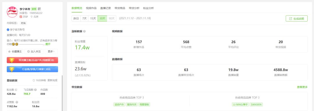 比如经历了一次爆火的鸿星尔克,官方抖音账号粉丝数比同为国货品牌的李宁多出1000万。但是,鸿星尔克的销售额却远不敌李宁。426.6万粉丝的李宁直播间近一个月卖出4588.8w,是鸿星尔克的2.6倍。